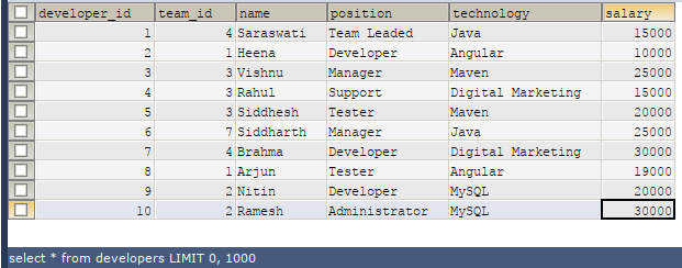 Let us consider one table name developers and check its contents using the following query. After retrieving the records of the developers table using the below SELECT query.