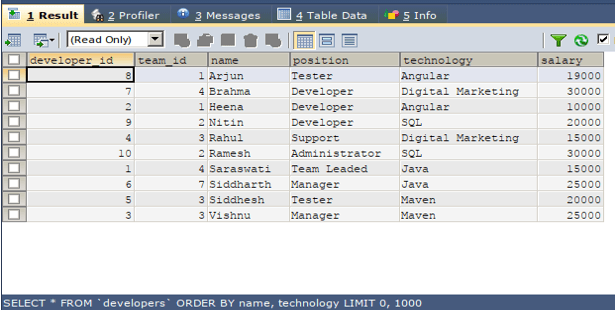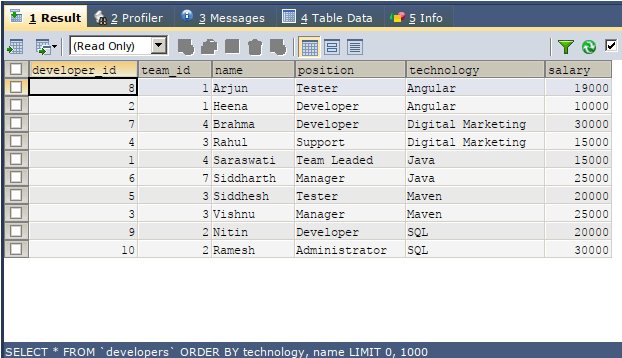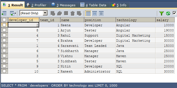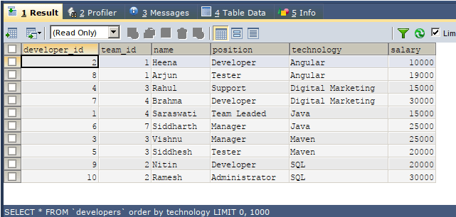 Now, let us simply order the records of the developer’s table based on the technology column value. For this, we can simply use the following query statement where we have just specified the name of the column that is the criteria on which the sorting is to be done without specifying what type of sorting needs to be done –