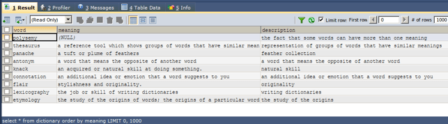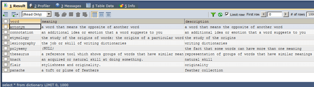 Let us retrieve the records that are ordered in alphabetical order from another table named dictionary. The contents of the table dictionary are as shown below using the select query of SQL –