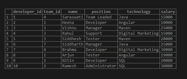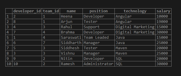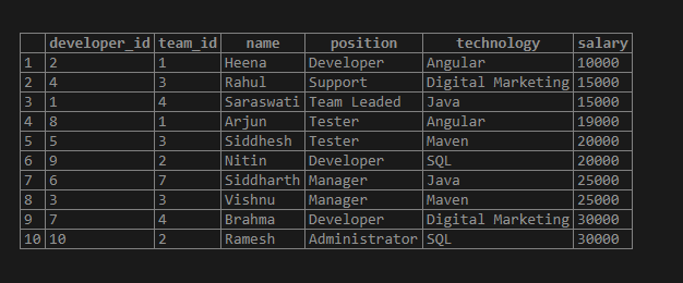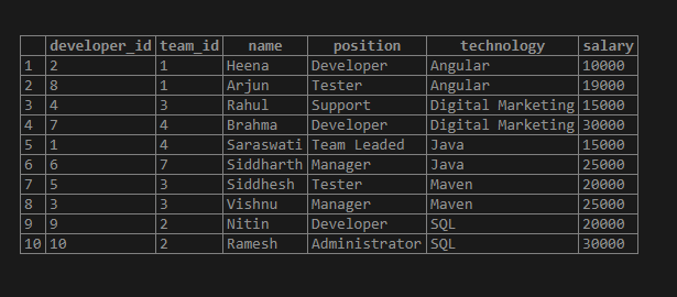 Now, let us simply order the records of the developer’s table based on the technology column value. For this, we can simply use the following query statement where we have just specified the name of the column that is the criteria on which the sorting is to be done without specifying what type of sorting needs to be done –