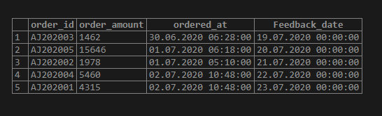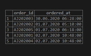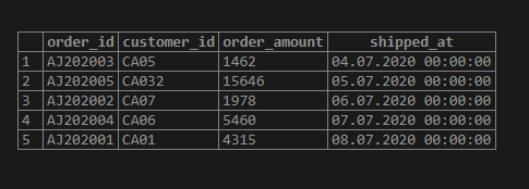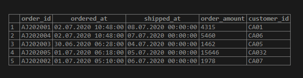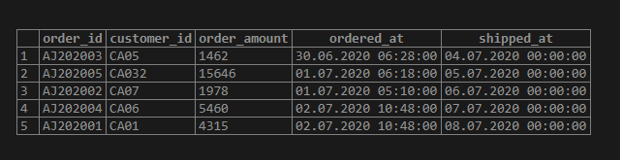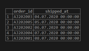 Note that we have two date fields, ordered_at and shipped_at columns. The former is of the DATETIME data type, and the latter is of the DATE data type. In the shipped_at field, we have just added a few days to the current date of the system.