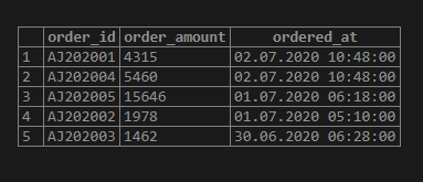 In order to illustrate the working of the ORDER BY DATE statement, what can be better than trying a few examples on a dummy table? Ergo, let’s create a dummy table called “e-transactions”. As the name suggests, the table contains details such as order date, ship date, etc., pertaining to orders placed on an e-commerce platform. We can use the following CREATE TABLE statement to create the said table.