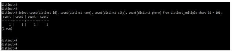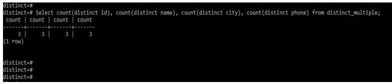 Select count(distinct id), count(distinct name), count(distinct city), count(distinct phone) from distinct_multiple;