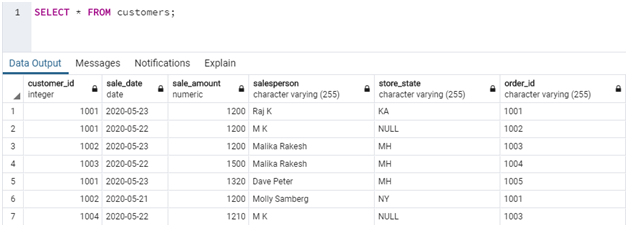We have successfully inserted 7 records in the table. The customer’s table after performing the above insertions looks something as follows: