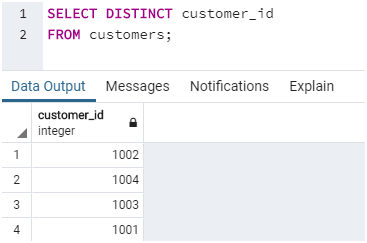In this example, we can see that the distinct keyword has fetched only the unique customer ids.