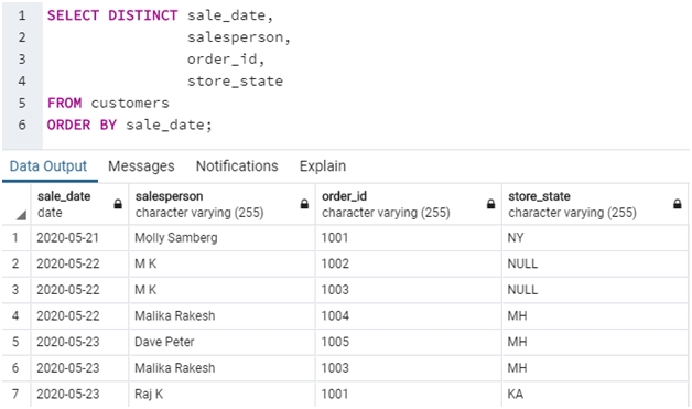 Explanation: The thing with NULL values and the DISTINCT keyword is that DISTINCT lets the first NULL in the final result set and removes all other subsequent NULL values. This can be observed in this example also. We had two NULL values in the store_state column, but DISTINCT has made room for only one NULL in the final result set.