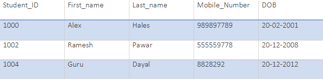 Suppose we have a database name “SCHOOL”. This database has tables, as mentioned below: