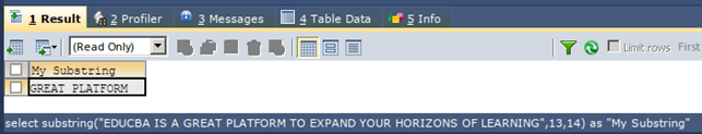 SELECT SUBSTRING("EDUCBA IS A GREAT PLATFORM TO EXPAND YOUR HORIZONS OF LEARNING",13,14) AS "My Substring";