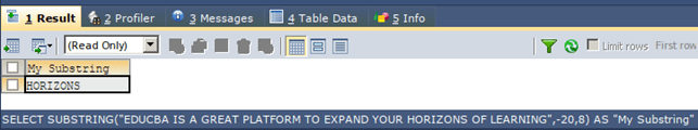 Now, we will try to use a negative start position instead of a positive one. Consider the same original string “EDUCBA IS A GREAT PLATFORM TO EXPAND YOUR HORIZONS OF LEARNING”. Now, we have to retrieve the substring “HORIZONS” from it. If we use the negative positioning, then the character H or the Horizons is located at the 20th position from the end and has 8 characters in it. Hence, our start position will be -20, and the length parameter will have the value 8. Our query statement will be as follows –