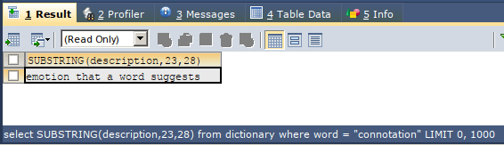 Now, we have to retrieve the substring “emotion that a word suggests” from the description column of the dictionary record whose word is connoted. For this, we will have to find the position of character e of emotion in the original string, which is 23. The substring that we want to retrieve has 28 characters in it. Our query statement will be as shown below –