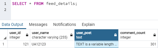 To illustrate working with the TEXT data type, let us create a dummy table called “feed_details” that contains details about posts made by users of a social media site and work with it. A simple CREATE statement for creating a feed_details table is as follows :