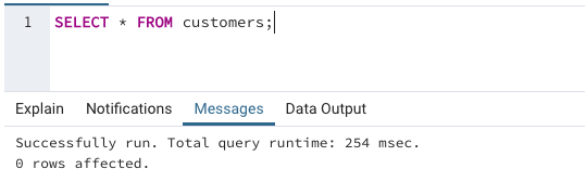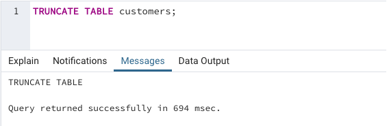 Next, let us run the TRUNCATE TABLE statement on the customer’s table to remove all its records. We can do so using the following SQL query.