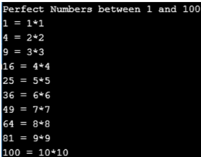 In this program, we find the number of square numbers within a specific range. We enter the range of numbers, and the code would produce the square number in that specific range. In the below program, we find the number of square integers between 0 and 100.