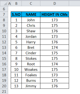 The below table contains three columns: Serial number in column B (B8 to B20), Name in column C (C8 to C20) & Height of person in column D (D8 to D20). We must find out the standard deviation of the Height of a person.