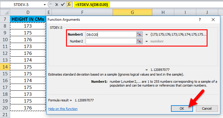 Number 2 argument: Since we have already covered the entire sample data through the range selected in step 2, there is no need to enter a Number 2 argument. Click ‘OK’ after entering the standard deviation arguments.