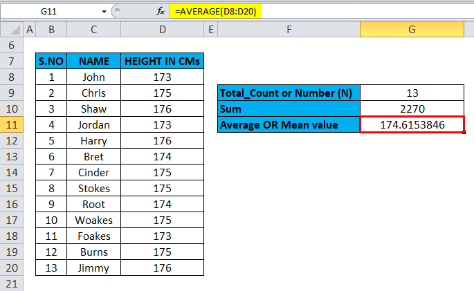 The Mean (Average) is calculated with the help of the Average formula, i.e., =AVERAGE (D8:D20) in cell G11.