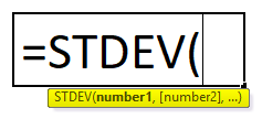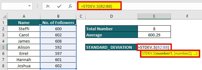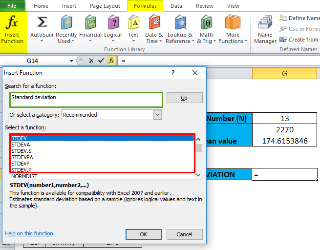 Here, we are calculating standard deviation only for the sample of the data set that is taken out from a large population. Therefore, we can select either STDEV.S or STDEV. Let’s use STDEV.S (for a sample) from the Statistical category by double-clicking on STDEV.S in Excel.