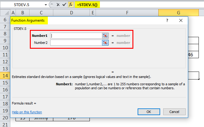 A dialog box appears where arguments for the standard deviation function need to be filled or entered, i.e., =STDEV.S (number1, [number2], …).