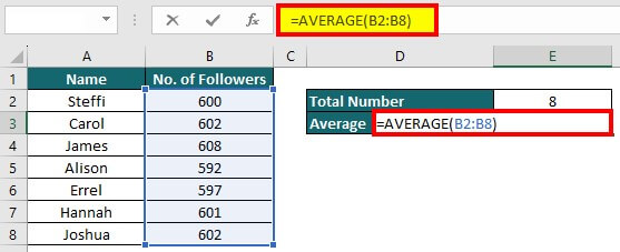 Now, we calculate the average using the formula =AVERAGE(B2:B8).