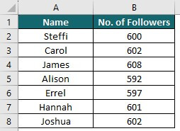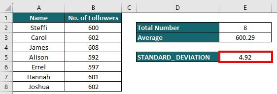 Let’s say the below individuals started their Instagram account on January 1st, and by January 31st, they had gained the corresponding number of followers. We want to calculate the standard deviation of their follower growth.