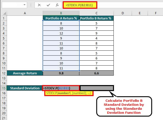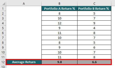 Similarly, we calculate the average of Portfolio B by using the formula =AVERAGE(C2:C11).