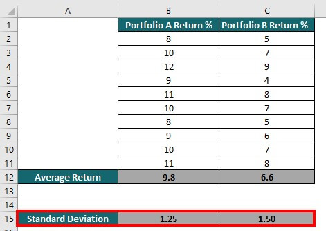 The table shows that the standard deviation of the returns for portfolio A is 1.25%, while the standard deviation for portfolio B is 1.50%. This suggests that Portfolio A is less risky than Portfolio B due to a lower standard deviation. In other words, the returns of portfolio A are more consistent over the past year, whereas the returns of portfolio B are more volatile.