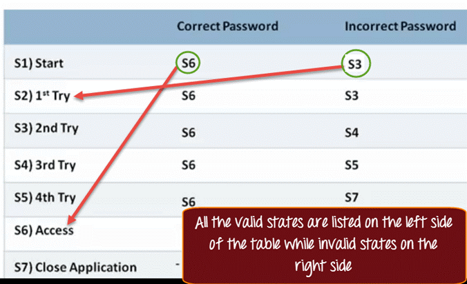 Let us take an example. When you are in the D1 state, then you enter the correct password, then you are moved to D6 state which is Access Granted State. In case we have keyed in the wrong password in the first try then you would be moved to D3 state or given a 2nd Try.