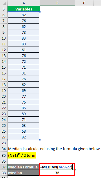 Median = (22/2 + (22/2 + 1)) / 2. Now, arrange the data set in ascending order (or descending order) to determine the median, 11th term 12th term 61, 62, 62, 63, 68, 69, 71, 71, 72, 76, 76, 76, 76, 77, 78, 82, 82, 83, 85, 89, 89, 91