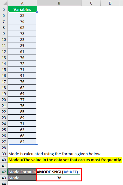 Now, let us take the example of a data set with even number of variables and calculate the statistics formula: 82, 76, 62, 78, 83, 89, 61, 76, 72, 71, 91, 76, 62, 69, 77, 76, 85, 89, 71, 63, 68, 82. The number of variables, N = 22. Calculates the mean, median, mode and variance of the above data set.