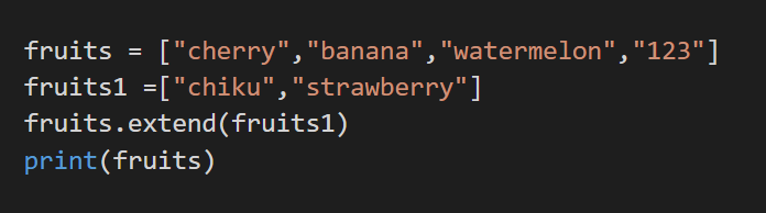 We add the elements to the end of the list here with the help of another list. Then the second list forms the extends the first list. Here it is how it is done.