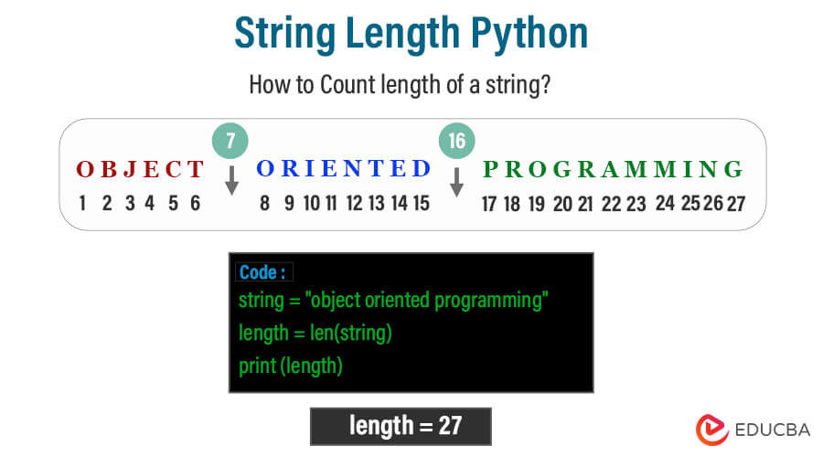 In this example, when you call len(my_string), the function iterates through the string “Welcome to eduCBA” character by character and counts each one. Since there are 17 characters in the string, including letters and a space, the len() function returns 17 as the length of the string.
