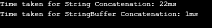 System.out.println("Time taken for StringBuffer Concatenation: " + (System.currentTimeMillis()