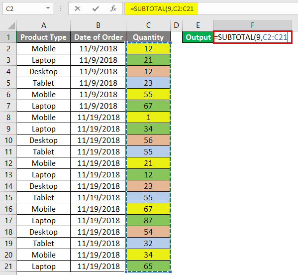 Now go to the cell where we need to see the output and type the “=” sign (Equal). And search and select the SUBTOTAL function as shown below.