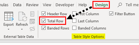 Once we do that, selected cells will convert into the table form. And another menu will add with the name Design in the menu bar. Now Check and tick the Total Row option from the Table Style Options.