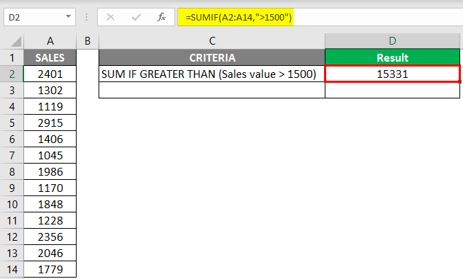 =SUMIF(A2: A14,”>1500″) formula sums the amounts in column D when they are greater than 1500 & returns the sum of sales value, i.e., 15331