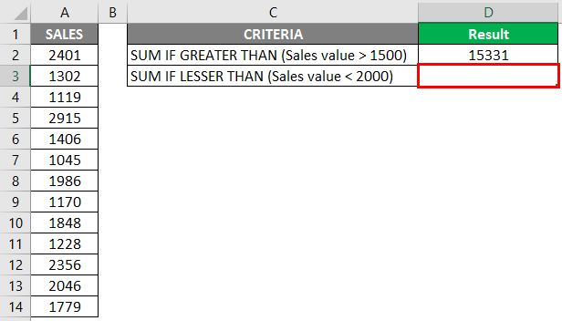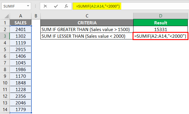 =SUMIF(A2: A14,” <2000″) formula sums the amounts in column D when they are lesser than 2000 & returns the sum of sales value, i.e., 15331