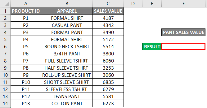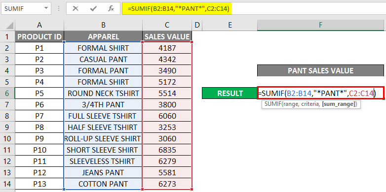 Suppose, in the below-mentioned example, I want to sum up OR add up the sales values for a specific text, i.e., the Apparel column containing “PANT” text in column C. Let’s check to use the SUMIF function with wildcard asterisk (*) in Excel.