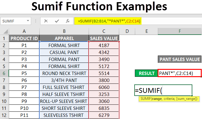 In the below-mentioned example, the table contains the list of product IDs in column A (A2 to A14), apparel in column B (B2 to B14), and its sales value in column C (C2 to C14). Here I want the sum of sales value for the Apparel column containing “PANT” text.