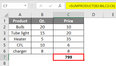 In the above formula, the first cell of the first array (Qt.) is multiplied by the second array’s first cell (Price). The second cell of the first array will be multiplied by the second cell of the second array, and so on, until the arrays’ fifth cell. After the arrays are multiplied, their product is added up to give the SUMPRODUCT, which is 799.