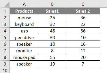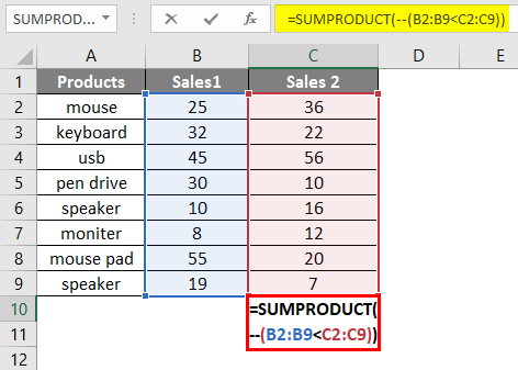 Here 4 products in sales 1 are sold less compared to sales 2. The double-negative (–) in the formula is used to convert True and False into 1 and 0 in Excel.