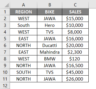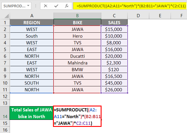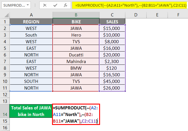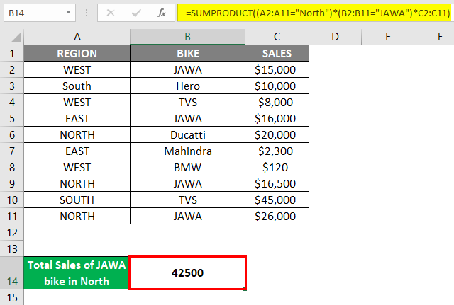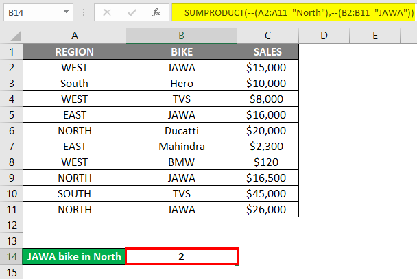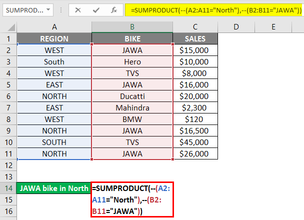 Suppose we want to count the sales of JAWA bikes in the North region. We can do so by writing the Excel SUMPRODUCT formula below: