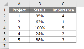 Here we have 5 different projects, their completion status, and their importance (rankings). We will now write the formula for a weighted average using the SUMPRODUCT function.
