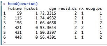 To inspect the dataset, let’s perform head(ovarian), which returns the initial six rows of the dataset.