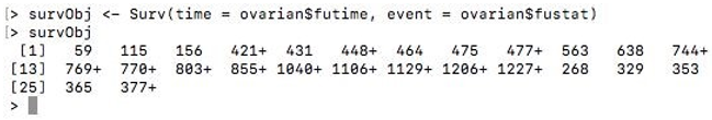 survObj <- Surv(time = ovarian$futime, event = ovarian$fustat)