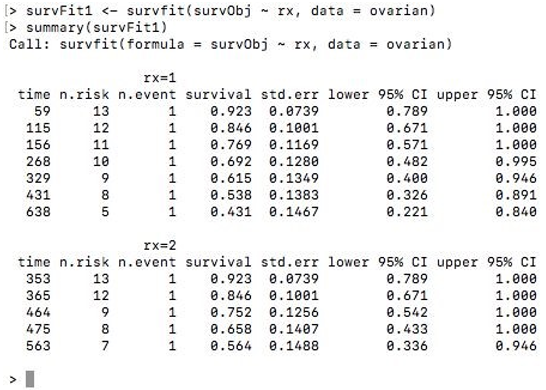 survFit1 <- survfit(survObj ~ rx, data = ovarian)
