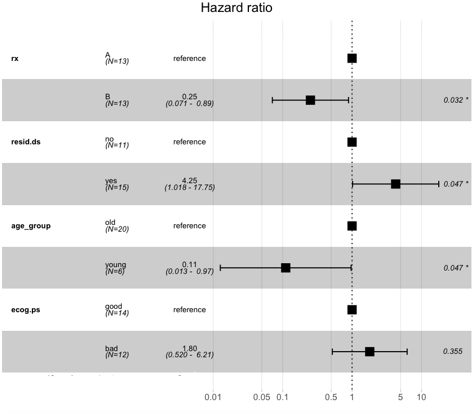 survCox <- coxph(survObj ~ rx + resid.ds + age_group + ecog.ps, data = ovarian)