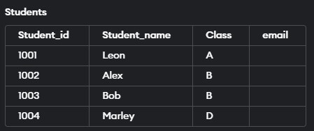 So, in this example, we will add an ’email’ column to the ‘Students table’. Let us look at the query for the same.