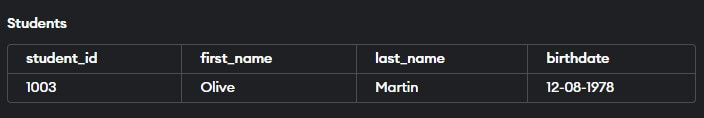 INSERT INTO Students (Student_id, first_name, last_name, birthdate)