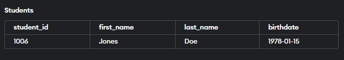 VALUES (1006, 'Jones', 'Doe', '1978-01-15');
