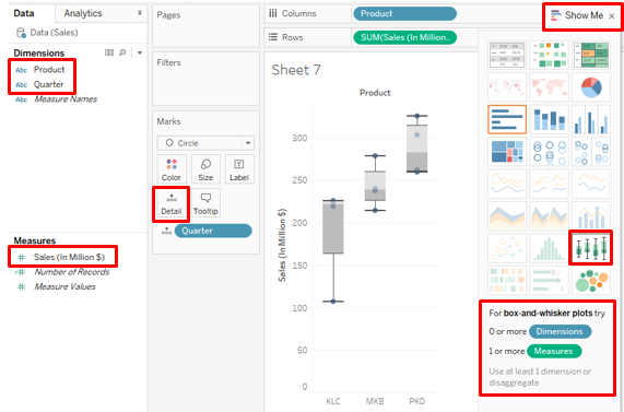 - It is a statistical plot that provides visual insight into the spread of data. Technically, it presents the data taking into consideration certain statistical factors: median, quartiles, inter-quartile-range, and outliers. To generate the Box and Whiskers plot, drag Product into Columns, Sales into Rows, and Quarter over Detail. Click on box-and-whisker plots in Show Me.